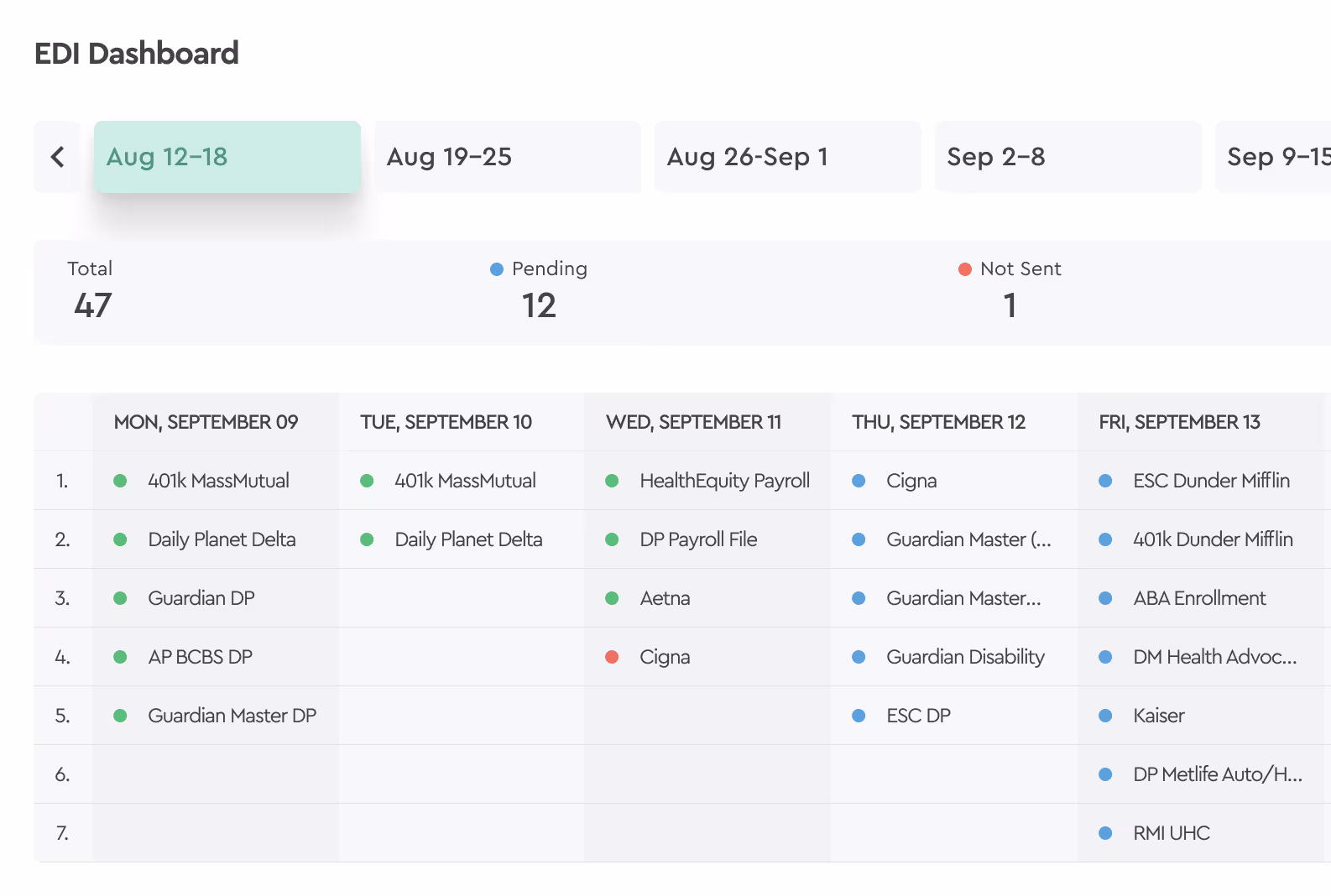Tabulera’s EDI Module combines data from multiple HRIS and payroll systems into a single, accurate EDI feed. With direct integrations to leading HR platforms, our typical go-live time is just 4 weeks, making it the fastest EDI solution on the market.