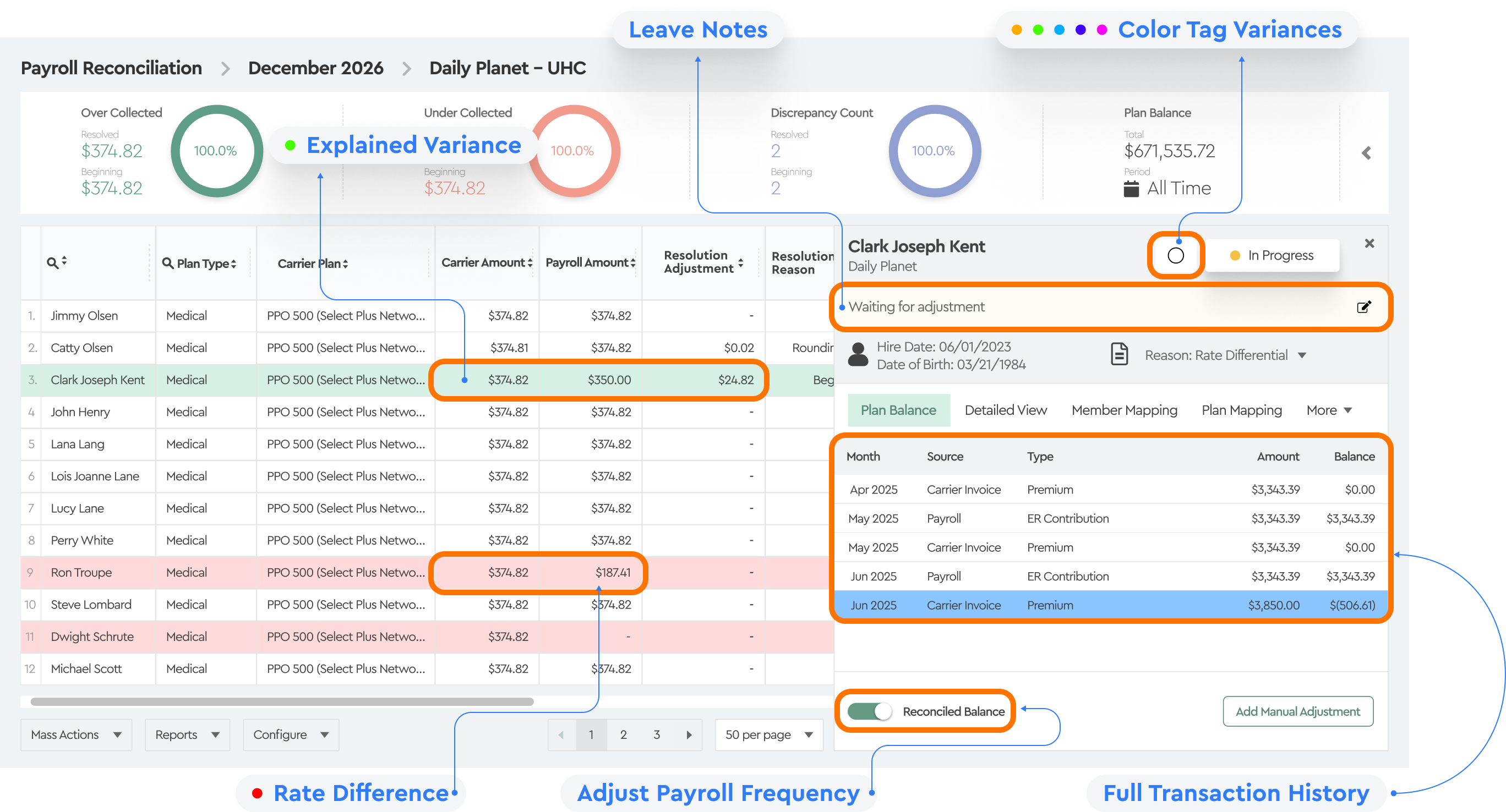 Clicking on any employee reveals their full plan balance history—every transaction since the start of coverage—so you can track down the cause of an issue without leaving the platform. You can also make manual adjustments if needed based on internal policy.When you're done, Tabulera generates clean reports for your finance team.